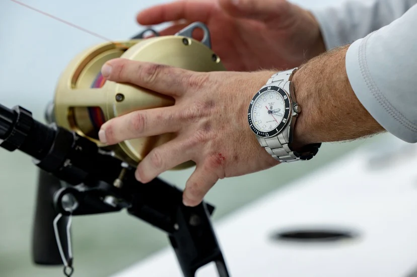 Our new Diver is exceptionally versatile. Whether you're spearfishing offshore or heading to a business meeting, our Diver performs and looks good doing it. This watch utilizes a surgical grade 316L 42mm stainless case with a unidirectional ceramic-plated bezel. The trigalight® glass tubes manufactured by MB-Microtec in Switzerland create luminosity on hour markers and hands for visibility underwater or at night. Our unique left-side crown orientation allows for supreme comfort while active. This is our first time using the new TMI caliber VH31 "sweeping second hand" movement and it is fantastic! At 4 beats per second, this movement has the smooth motion of an automatic and the durability of a quartz movement. The Diver is sure to become a fan favorite!